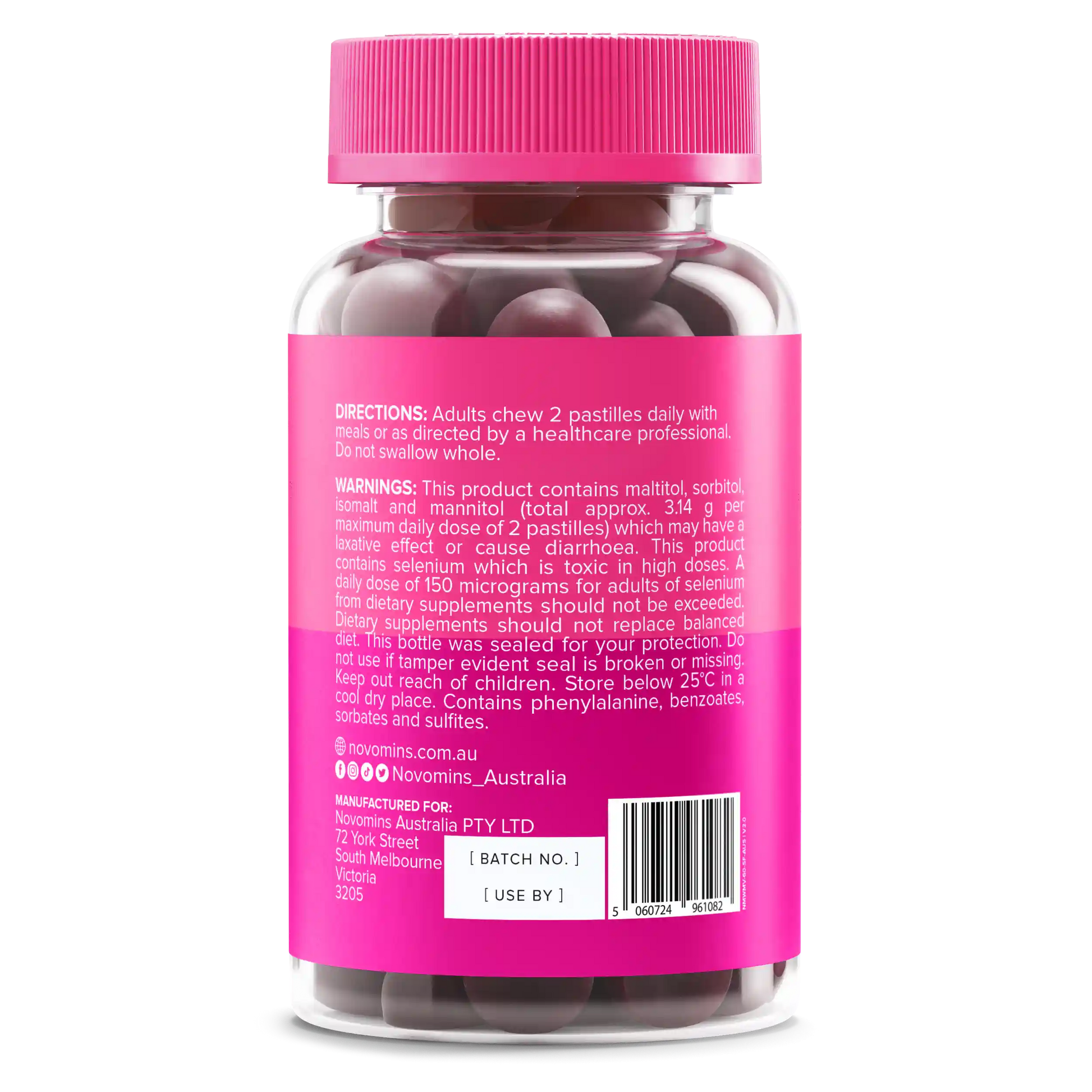 Warnings: This product contains malitol, sorbitol, isomalt and mannitol (total approx. 3.14 g per maxium daily dose of 2 pastilles) which may have a laxative effect or cause diarrhoea. This medicine contains selenium which is toxic in high doses. A daily dose of 150 micrograms for adults of selenium from dietary supplements should not be exceeded. Dietary supplements should not replace a balanced diet. This bottle was sealed for your protection. Do not use if tamper evident seal is broken or missing. Keep out reach of children. Store below 25°C in a cool dry place. Contains phenylalanine, benzoates, sorbate and sulfites.